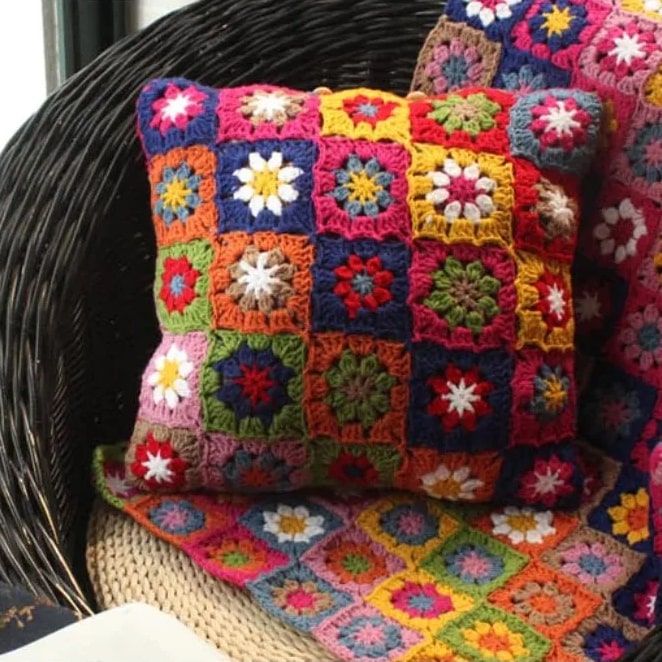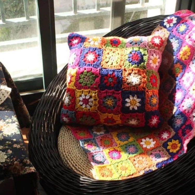 Apportez chaleur et style avec le Coussin au crochet multicolore avec motifs de fleurs brodés